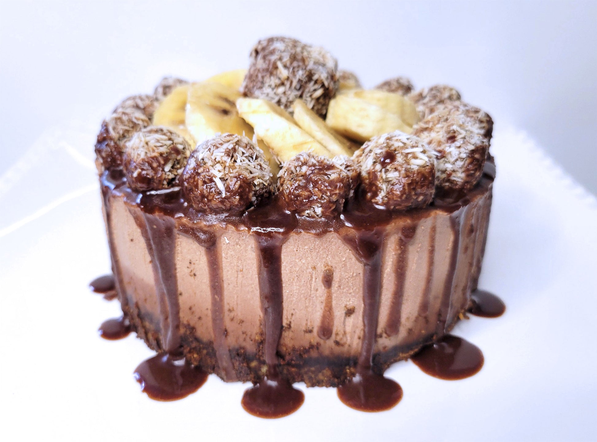 Our basic vanilla cashew cake topped with chocolate, bananas, and energy balls made of goji berries, acai, chia seeds, hemp seeds, apricots, walnuts, and shredded coconut.